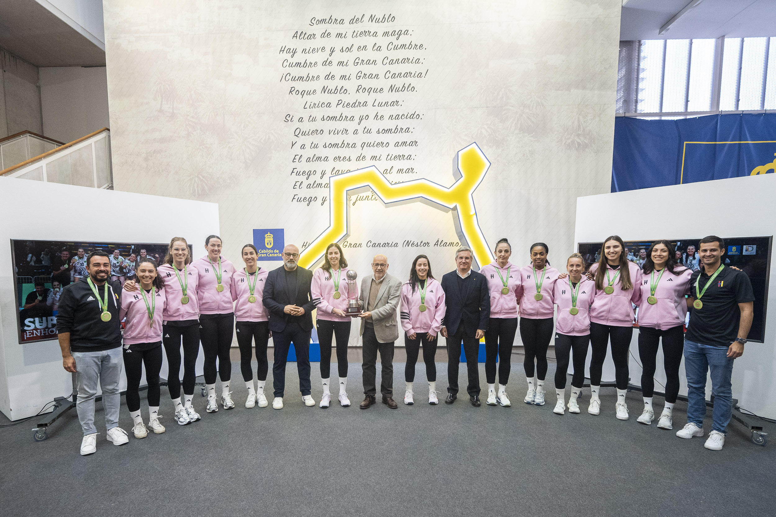 Continúan los reconocimientos para el Heidelberg Volkswagen tras su flamante título de Supercopa de España. La plantilla y el cuerpo técnico han recibido este miércoles el agasajo y el respaldo del presidente del Cabildo de Gran Canaria, Antonio Morales, y del consejero de Deportes insular, Aridany Romero, quienes han puesto en valor la hazaña del club colegial y su capacidad formativa con los 600 niños y niñas de la cadena deportivo de la institución.