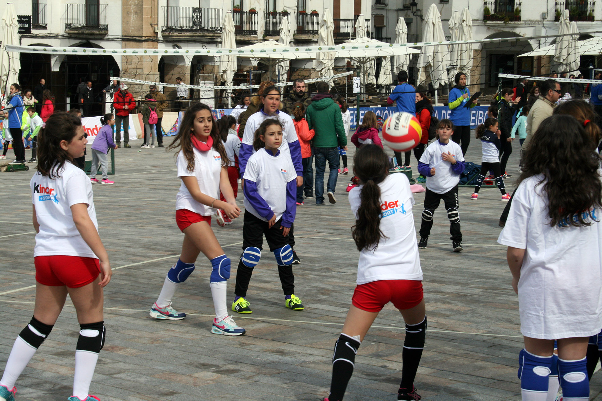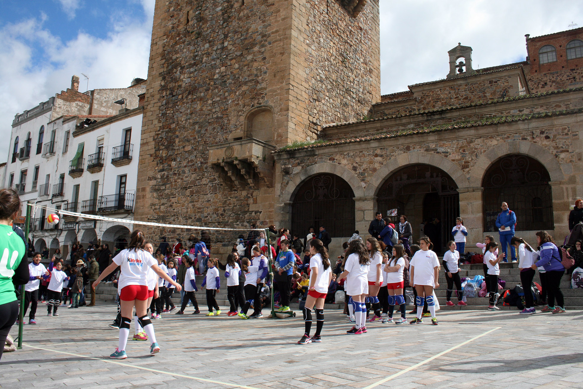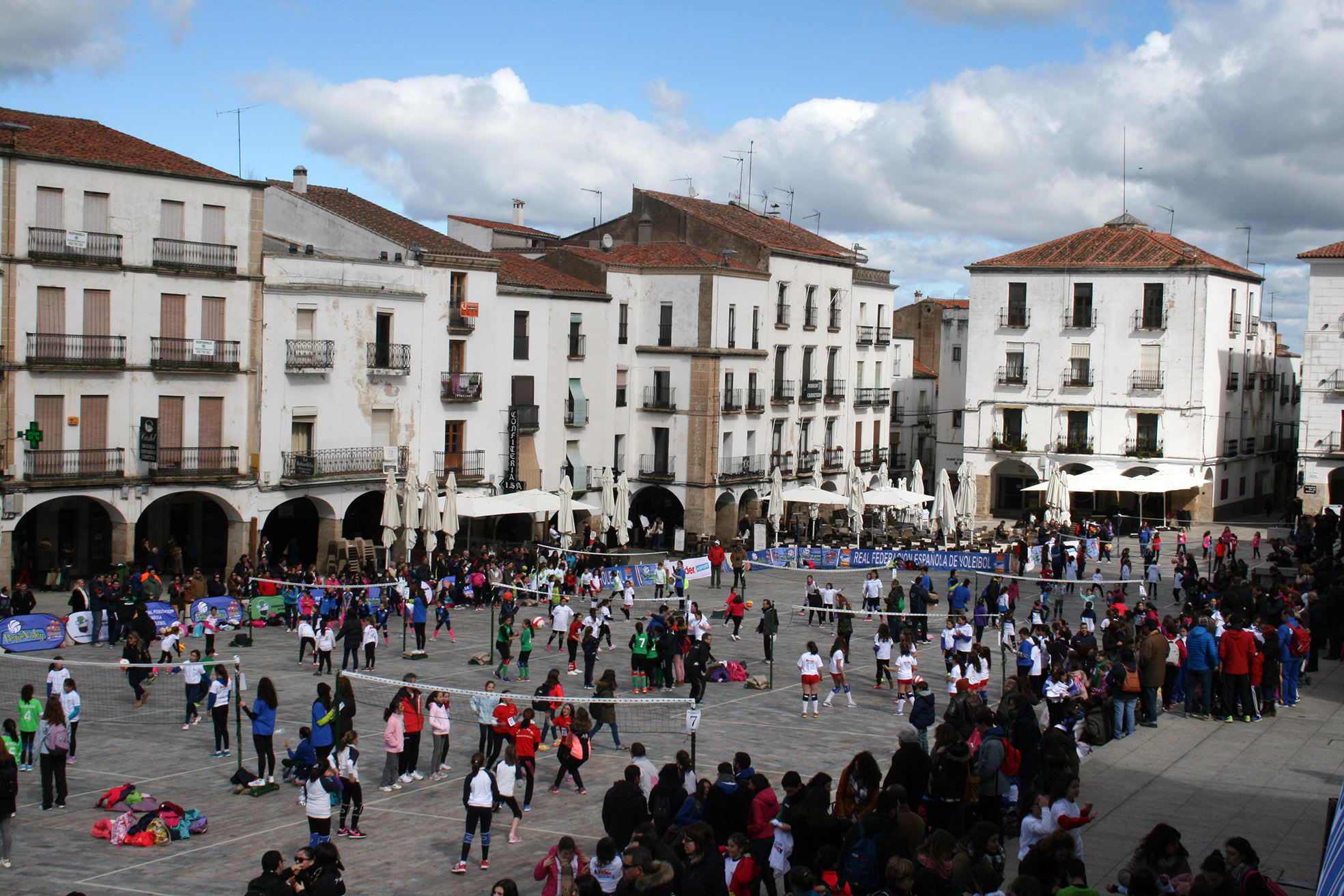 La Plaza Mayor de Cáceres fue tomada por más de ochocientos deportistas en las horas previas a la celebración de la final de la XLI Copa del Rey. La localidad extremeña acogió uno de los eventos Pequevoley más espectaculares y multitudinarios, un acto en el que estuvieron presentes miembros de varios de los conjuntos participantes en el torneo del KO y que disfrutaron del esfuerzo y la ilusión de los más jóvenes jugadores.