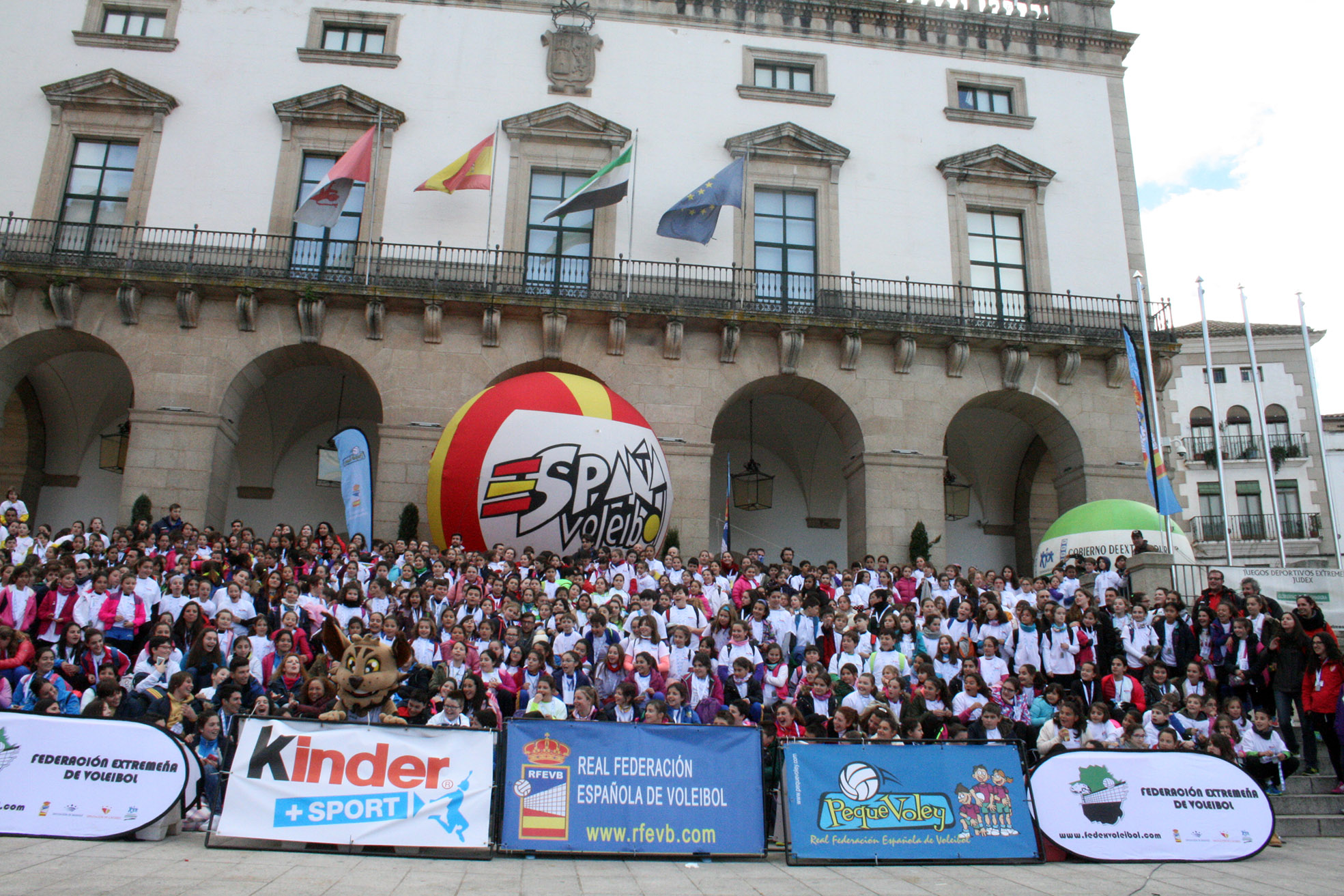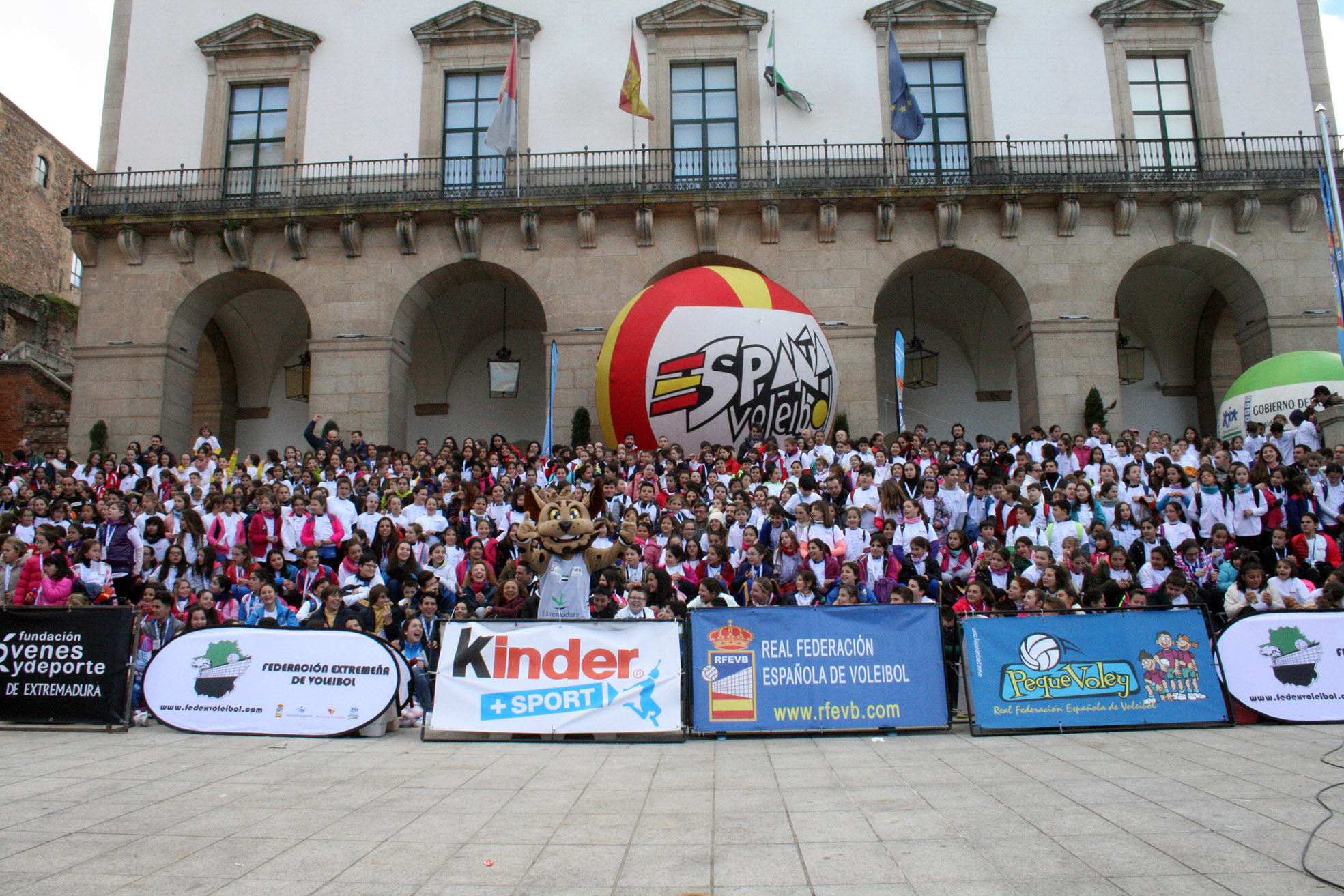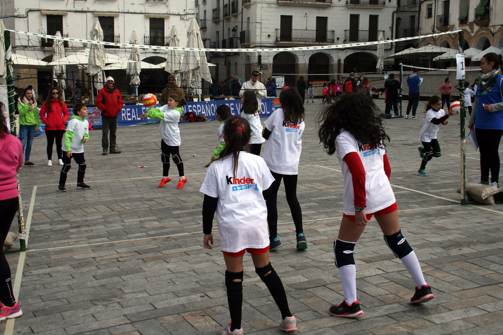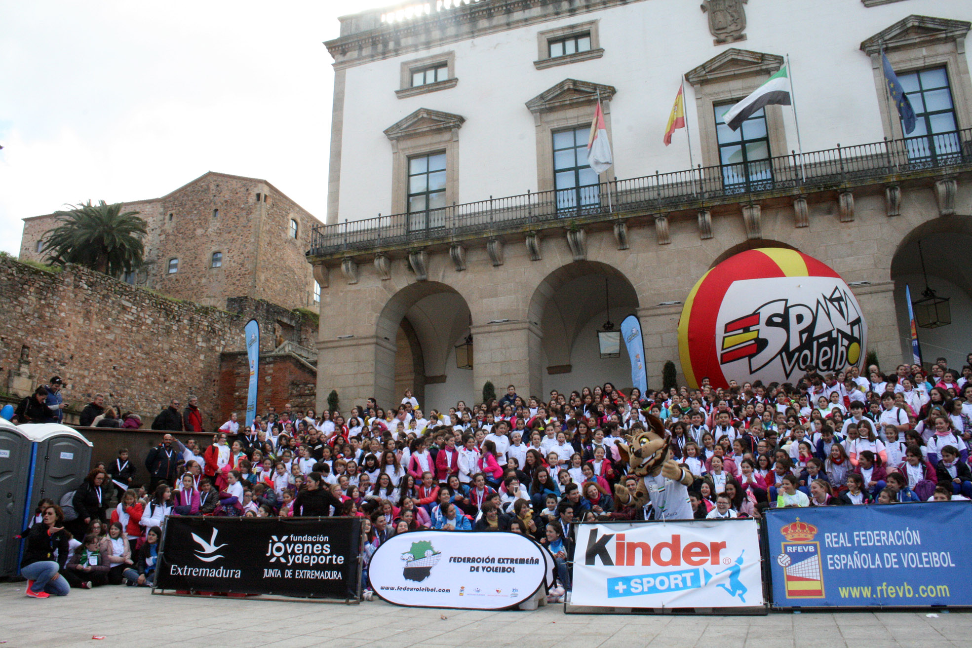 La Plaza Mayor de Cáceres fue tomada por más de ochocientos deportistas en las horas previas a la celebración de la final de la XLI Copa del Rey. La localidad extremeña acogió uno de los eventos Pequevoley más espectaculares y multitudinarios, un acto en el que estuvieron presentes miembros de varios de los conjuntos participantes en el torneo del KO y que disfrutaron del esfuerzo y la ilusión de los más jóvenes jugadores.