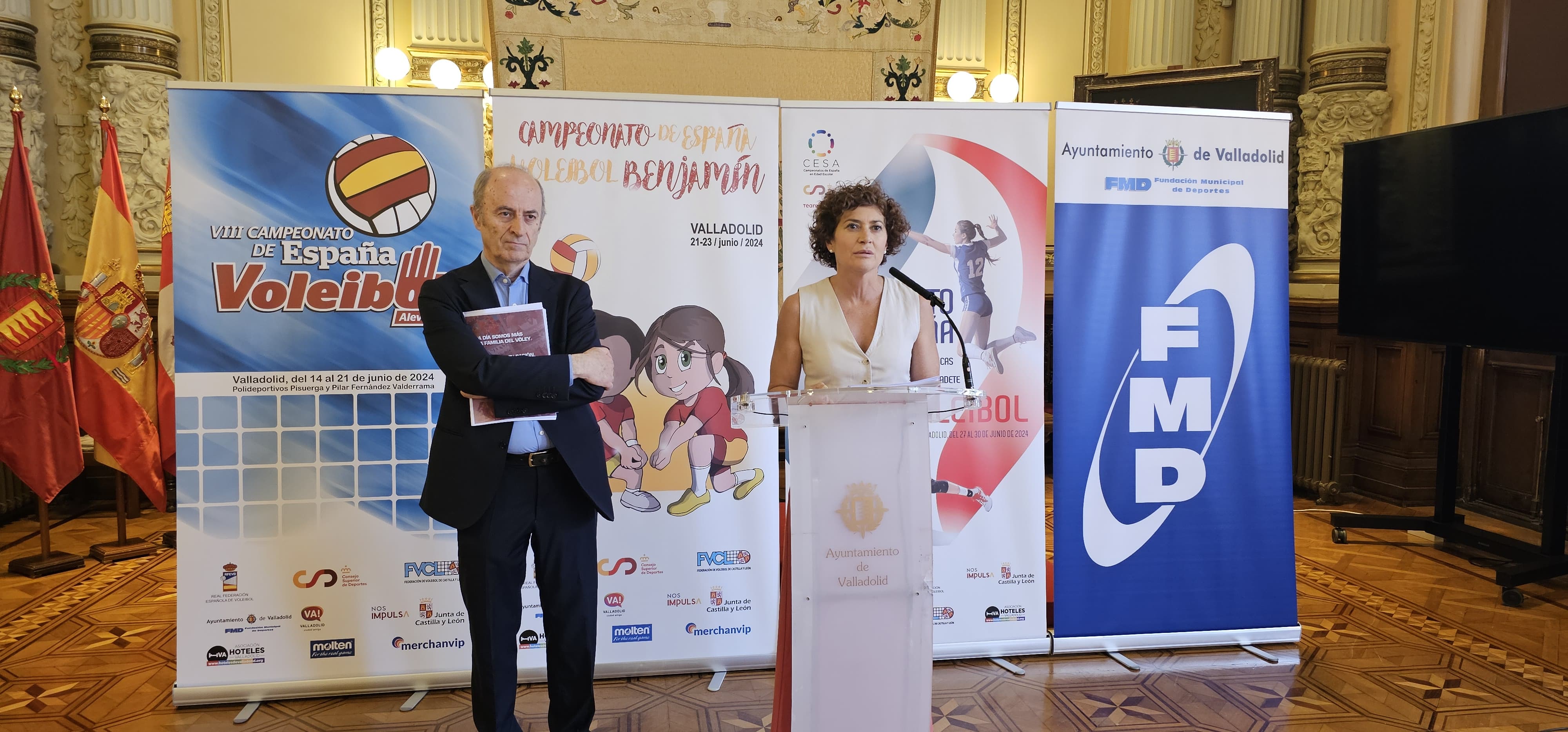 La concejala de Participación Ciudadana y Deportes, Mayte Martínez, junto al presidente de la Real Federación Española de Voleibol, Agustín Martín Santos, han presentado hoy en el Salón de Recepciones del Ayuntamiento los tres campeonatos nacionales que se desarrollarán en Valladolid durante el mes de junio: el VIII Campeonato de España Alevín, el III Campeonato de España Benjamín y el Campeonato de España de Selecciones Autonómicas Infantil y Cadete.