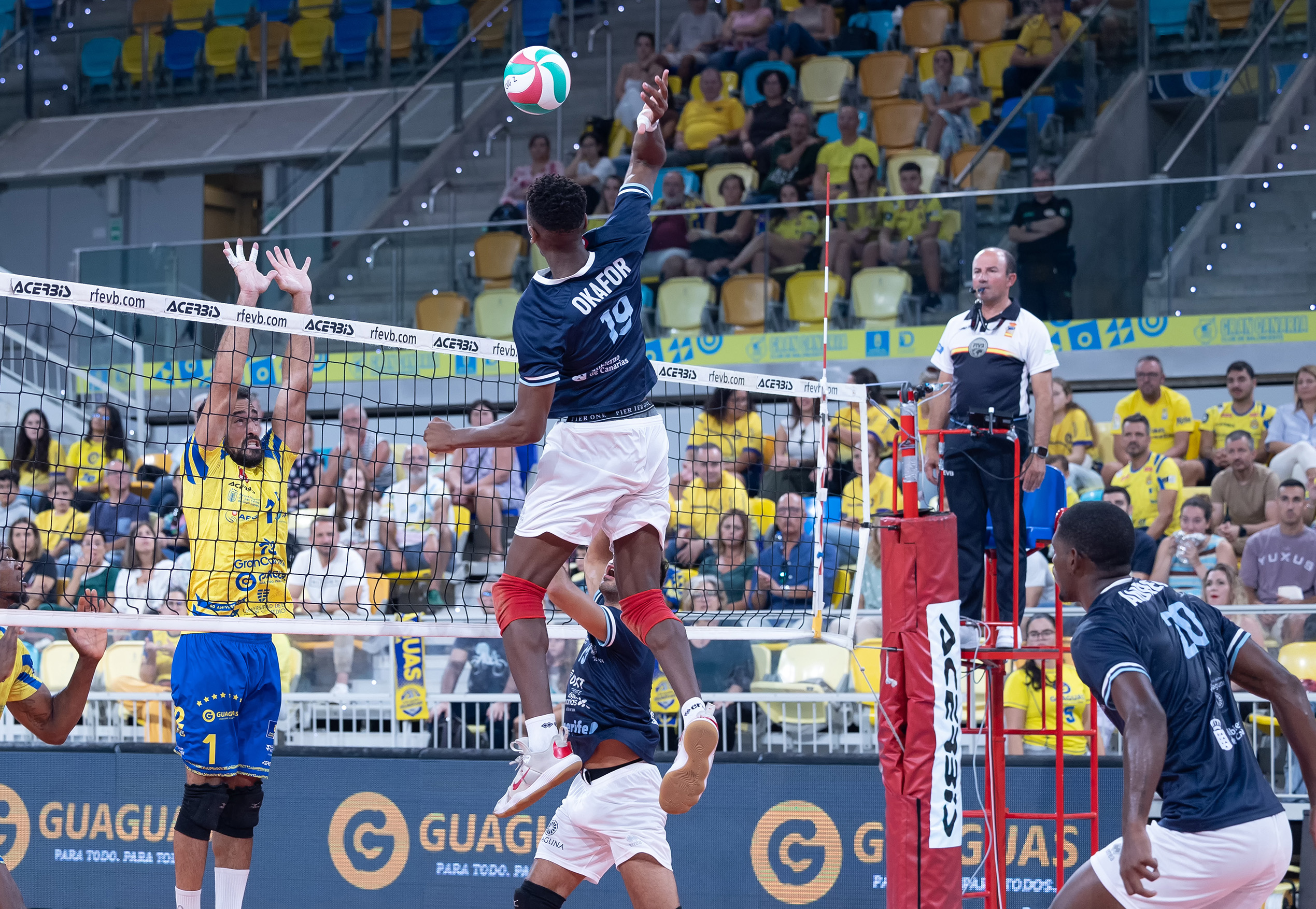 Desde los primeros compases, el conjunto amarillo impuso su ley en todas las facetas del juego. Los potentes saques de Nico Bruno, la efectividad ofensiva de Osmany Juantorena y la pegada de Walla Souza abrieron rápidamente brecha en el marcador (19-8). El Guaguas dominó con autoridad y cerró el primer set por un contundente 25-12, dejando claro quién manda en Canarias. El segundo set fue otro cantar.