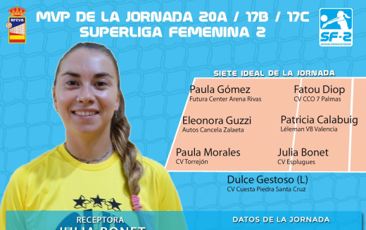 La receptora de CV Esplugues Julia Bonet es la MVP de la 20ª jornada de Superliga Femenina 2. La jugadora catalana resultó determinante con sus 24 puntos, 5 puntos directos de saque para vencer en el duelo directo por la clasificación para la fase de ascenso ante Volei Grau Castelló y conseguir su segundo galardón de la temporada.