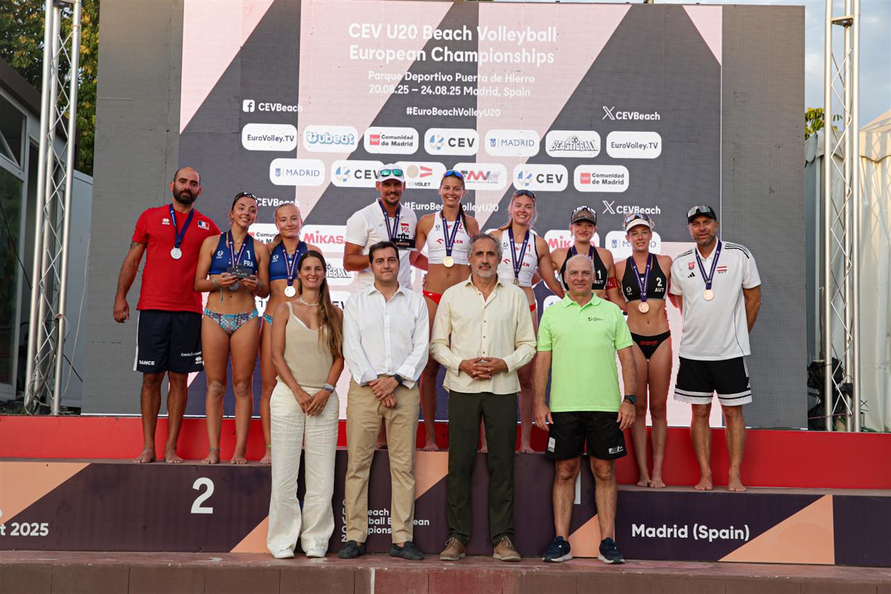 La ceremonia de clausura reunió a destacadas autoridades para completar la jornada del Campeonato Europeo Sub-20 de vóley playa. En el podio estuvieron presentes Felipe Pascual, presidente de la Real Federación Española de Voleibol; Javier García, vicepresidente de la Real Federación Española de Voleibol; Delfina Ferrer, miembro de la junta directiva de la Federación de Madrid de Voleibol; y Ioannis Tsimpinos, supervisor de la Confederación Europea de Voleibol, encargados de entregar los trofeos y medallas a los nuevos campeones de Europa Sub-20.